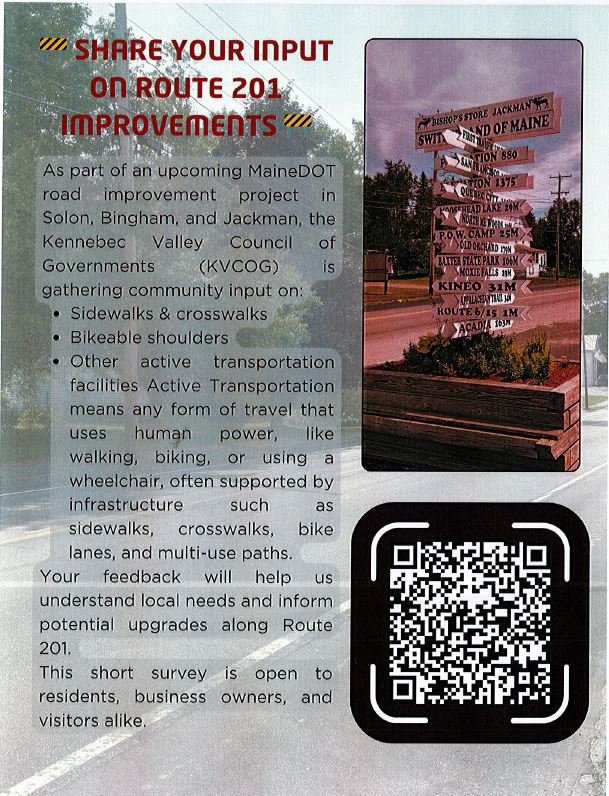 As part of an upcoming MaineDOT Road Improvement project in Solon, Bingham and Jackman, the Kennebec Valley Council of Governments (KVCOG) is gathering community input on