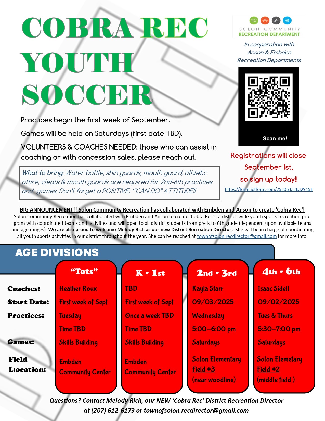 Registration will close September 1st. Download the BAND APP to stay up to date on team information. If you need an invite, please contact your coach, the Rec Director or the Solon Town Office.